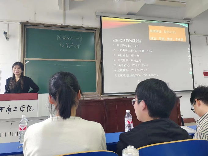 张茜首先介绍了学院近三年考研上线、毕业生就业等情况,提出三点希望:一是希望同学们理性分析、清晰定位,确立自己的考研方向和就业目标;二是希望同学们稳扎稳打、脚踏实地,为实现目标全力以赴;三是希望同学们保持乐观、积极进取,创造佳绩。