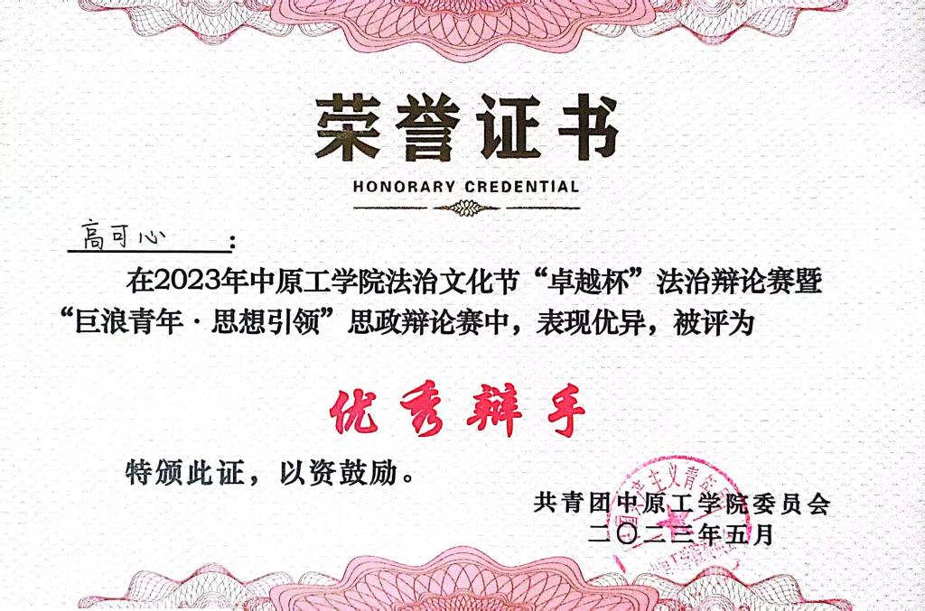 她积极投身社会实践,参与各种志愿活动,在入学之后加入了太阳集团tcy8722国旗护卫队,在队内表现优异、勤奋刻苦,多次作为护旗手参加升旗仪式。由于喜欢辩论,主动请缨,结合自身兴趣爱好组建了太阳集团网址8722辩论队,在2023年太阳集团tcy8722“卓越杯”法制辩论赛被评为“优秀辩手”,带领队员获得2024年太阳集团tcy8722“知行杯”季军。