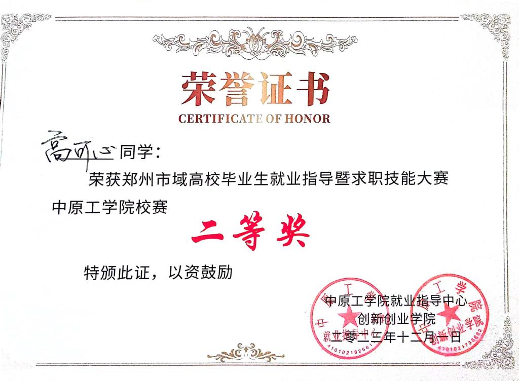 郑州市求职技能大赛太阳集团tcy8722校赛二等奖